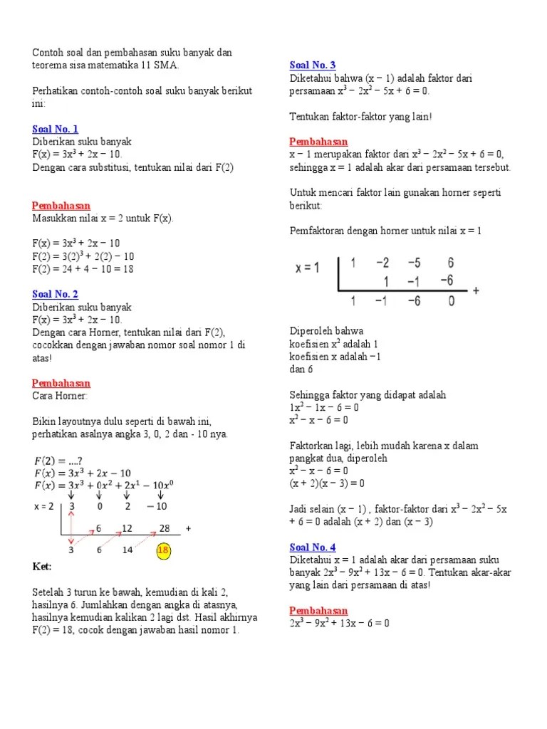 Suku banyak atau polinom dalah pernyataan aljabar yang berbentuk: Contoh soal pembagian suku banyak dan metode horner soal dan pembahasan polinomial teorema sisa contoh penjumlahan pengurangan dan perkalian . Carilah terlebih dahulu nilai m dengan substitusi polinomial f(2) = 0, karena . Contoh soal polinomial menjadi topik pembahasan pada kesempatan kali ini. Fendi alfi fauzi∗ 9 maret 2014 1.